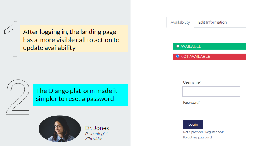 Survey trends showed providers call for a clearer calls to action for common tasks (e.g. updating availability & resetting password).